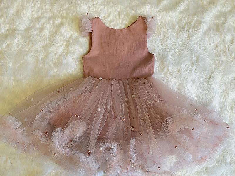 Сукня кольору припилена троянда. Ніжно рожевого кольору. Прикрашена бусинами, ззаду на гудзиках. Колір трохи відрізняється ніж на фото! Будь ласка уважно перевіряйте товар на пошті, бо поверненню не підлягає! Вдалих вам покупок!)
