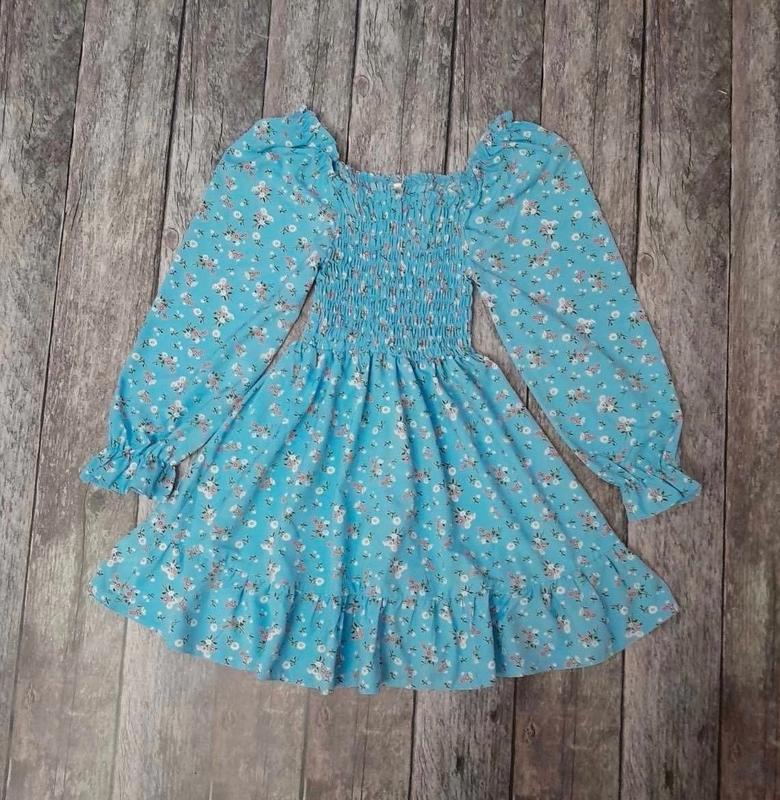 Мила сукня для дівчат. Тканина - софт, гарної якості. Верня частина сукні зібрана, гарно тянеться. Заміри: 140 довжина - 68см, напівобхват грудей - 23см, рукав- 57см. 146 довжина - 69см, напівобхват грудей - 23см, рукав - 59см. 152 довжина - 71см, напівобхват грудей - 24см, рукав - 61см.