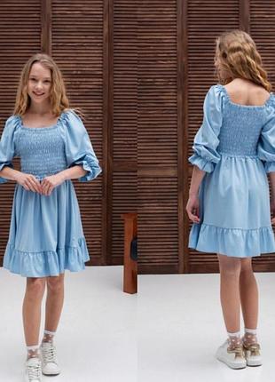 В наявності! Мила сукня для дівчат. Тканина - літня костюмна. Верня частина сукні зібрана, гарно тянеться. Рукав - 3/4. Заміри: 140 довжина - 68см, напівобхват грудей - 23см. 146 довжина - 69см, напівобхват грудей - 23см. 152 довжина - 71см, напівобхват грудей - 24см.