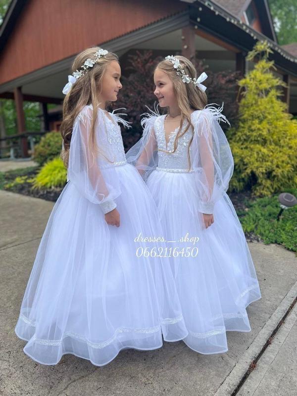 Пошив под заказ Быстро и качественно Сукня до причастя - евросетка с блеском, перья - пышный рукавчик с кружевным блеском -мегапишна спідничка -шнуровка -пояс прикрашений перлинами Цвет: белый, молочный ⚡Цена : 3950 грн