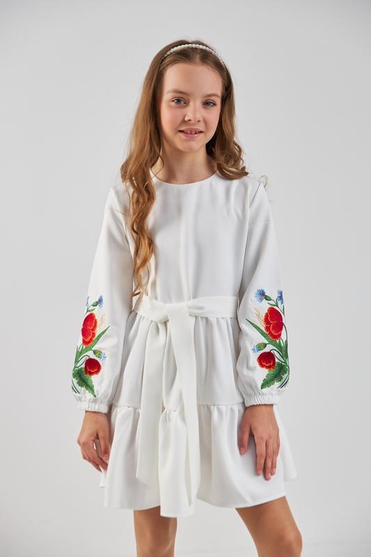 ландиш ✅️В НАЯВНОСТІ 💞✨️Неймовірно гарна та ніжна сукня На рукавах вишивка тканина костюмка барбі по спинці застібається на змійку, поясок в коплекті колір молочний 💋128(1 шт)-довжина 66,рукав 43,пог 36 💋134(1 шт)-довжина 71,рукав 45,пог 37 💋146(1 шт)-довжина 76,рукав 50,пог 39 +-2 см