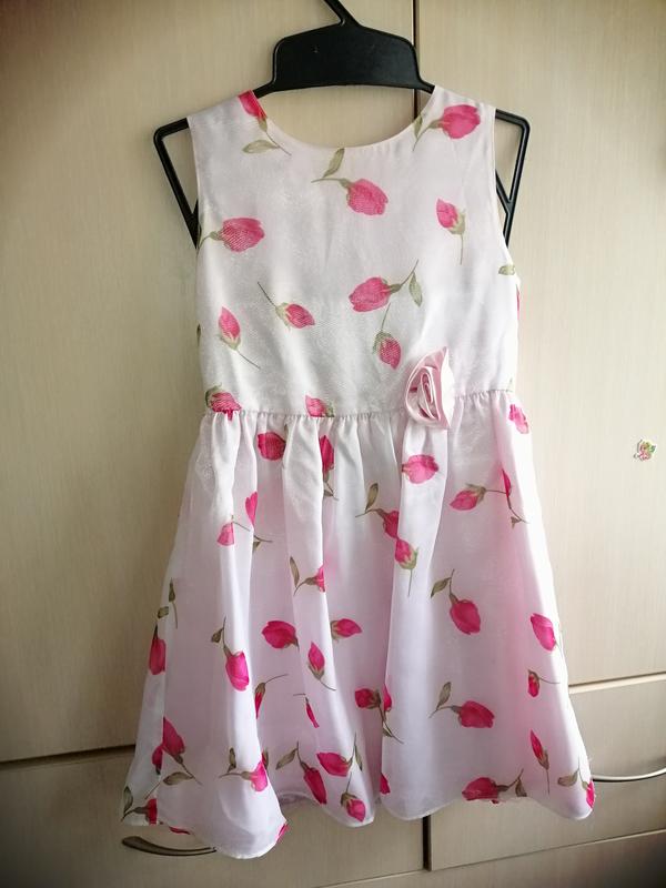 Ніжна сукня в квітковий принт з квіткою на поясі, на підкладці. Нюанси - малопомітні плями по переду і ззаду, показала на фото. Застібка - змійка