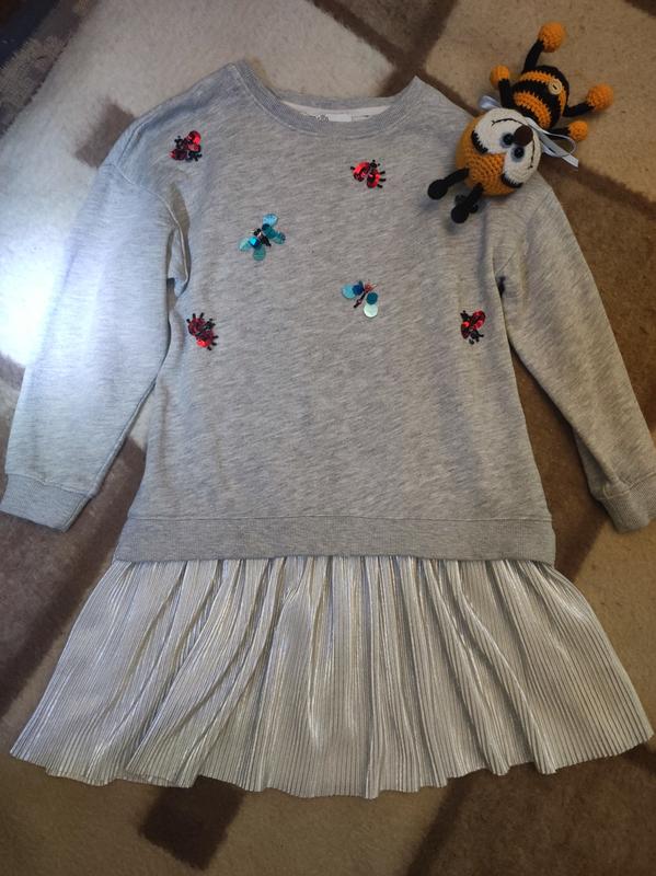 Цікава комбінована сукня з довгим рукавом. Верх трикотажний- бавовна, спідничка,гофрована, з блиском- поліестр. Оздоблення- паєтки. Плече спущене. Стан ідеальний 🌷Ширина виробу у грудях- 76 см 🌷Плече плюс рукав-53 см 🌷Довжина сукні- 72 см Оплата на карту,повернення нема. Відправлю Укр та Новою поштою