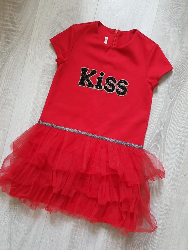 Святкова сукня для дівчинки . Стан ідеальний. Спідниця із фатину. Напис на грудях зі страз. Дуже красива сукня. Розмір 128. Ширина - 33 см. Довжина- 61 см.