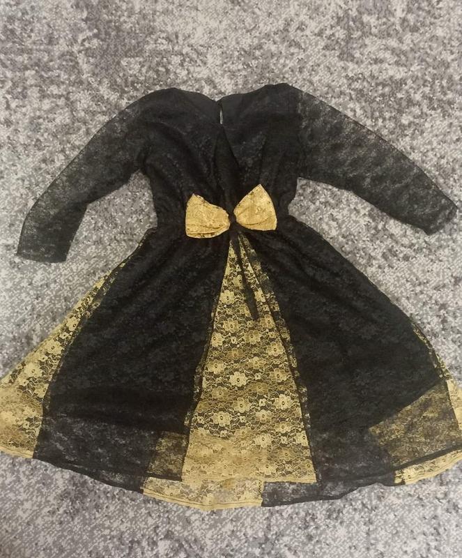 легенька кружевна святкова сукня в чорно-жовтому кольорі з бантом,ззаду застібка гудзик,на поясі резиночка,одягалось 2 рази довжина по спинці 68 см рукав від плеча 35 см