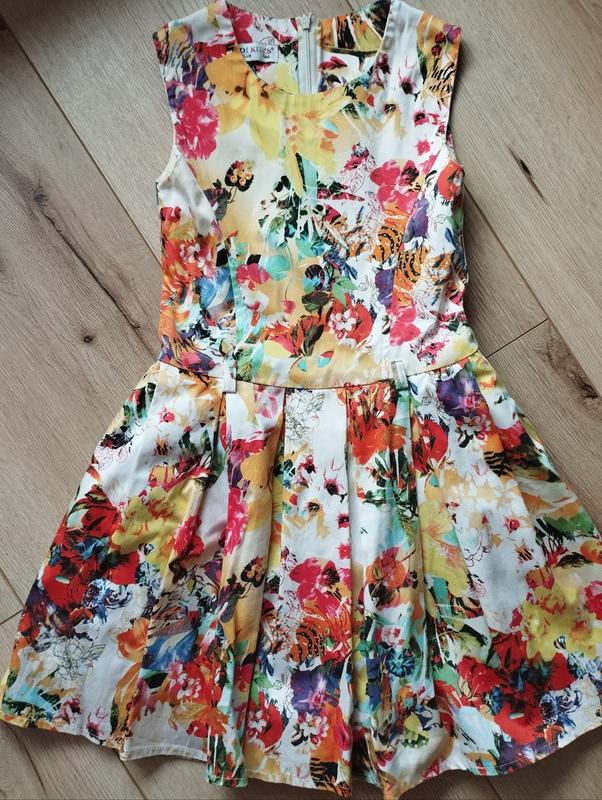 Яскрава сукня в квіти на свято, на вік 7-8 років. Тканина цупка, стрейч, є підюбник і слой фатіну, гарно тримає форму, на замку. Вдягнена кілька разів, гарний стан. Заміри: довжина 71 см, плям 30 см, пог 31 см.
