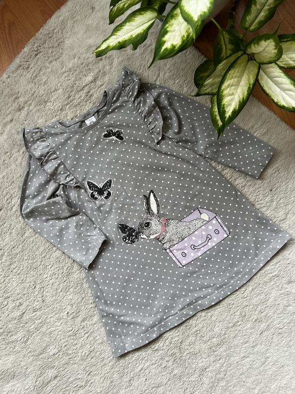 Мила сукня з натуральної тканини, чарівний малюнок, накатка кролик а метелики пришиті. Дуже класно виглядає на дитині.