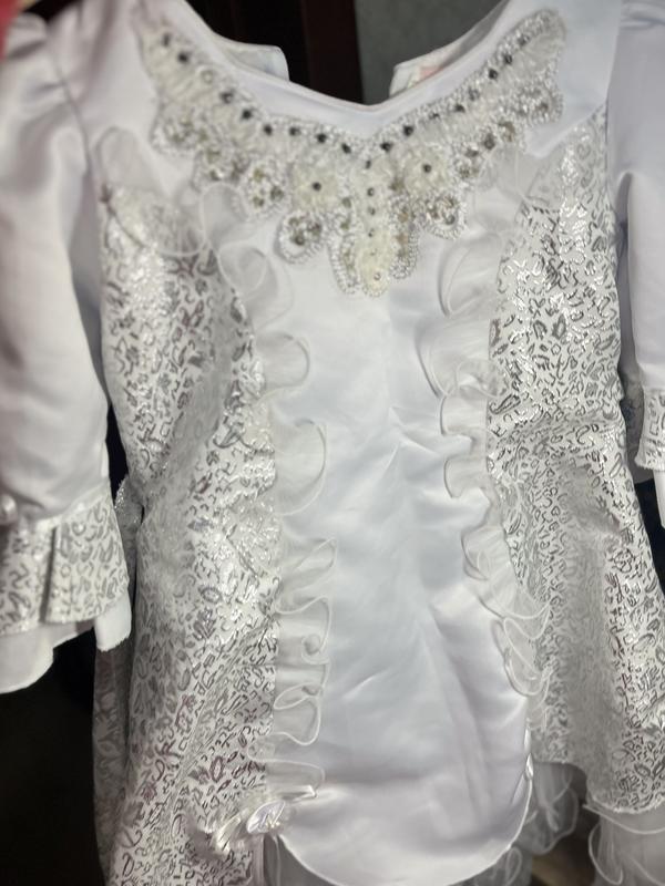 Напів обхват грудей 36 см. Напів талія 37 см.,фіксується пояском. Довжина 70 см. Низ сукні має підкладку та фатін Наяву дуже гарна сукня,фото не передає Білий атлас і срібна вишивка