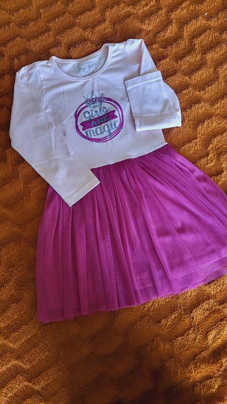 Платье для девочки с юбкой из фатина. Платье из мягкого трикотажа из органического хлопка ткань двунитка. Круглый вырез горловины, манжеты в рубчик на конце рукавов. Длинные рукава, юбка притачная из фатина.