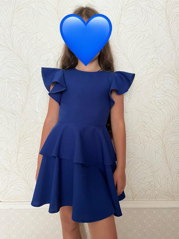 Стан ідеальний. По бірці зріст 128, на фото зріст дитини 139. Щільна тканина, не тягнеться. Застібка блискавка на спині і широкий пояс.