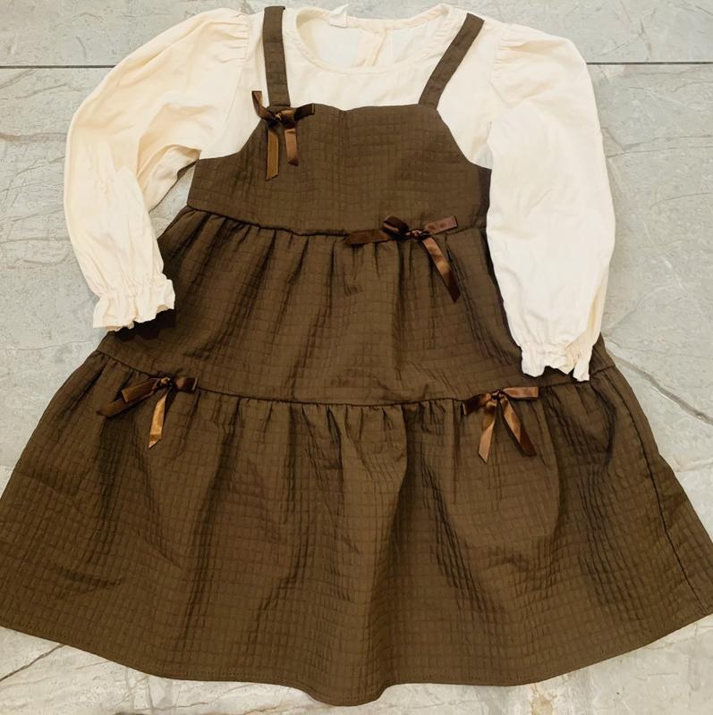 ● Сукня легка. Іде обманка: рубашка-юбка. Довгий рукав, є ризинка. Тканина - cotton, polyester. Ріст на 120, носили на 4 рочки (треба дивитись по замірам). Є фото на дитині. Сукня вільного покрою. Стан ідеальний. - довжина: 56 см - довжина плечей: 23 см - довжина рукава: 34 см - пів обхват: 30 см - на стегнах резинки немає, довжина: 29 см - від стеган, довжина: 35 см.