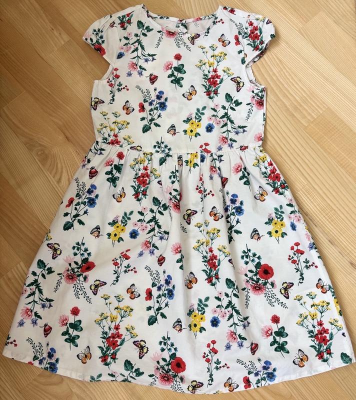 Ніжна сукня білого кольору з яскравим квітково-метеликовим принтом. Легка, дихаюча тканина, зручний фасон зі злегка завищеною талією та пишною спідничкою — чудово підходить для літа, свят або повсякденного носіння. 🔸 Розмір: 128–134 см (приблизно 8–9 років) 🔸 Матеріал: 100% бавовна Пишіть у повідомлення, якщо потрібні точні заміри чи додаткові фото.