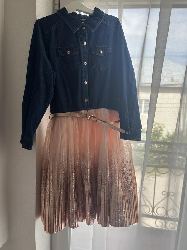 Нова сукня, верх тонкий джинс, низ фатін з блискучим напиленням. Рукав можна закочувати, є гудзичок для фіксації