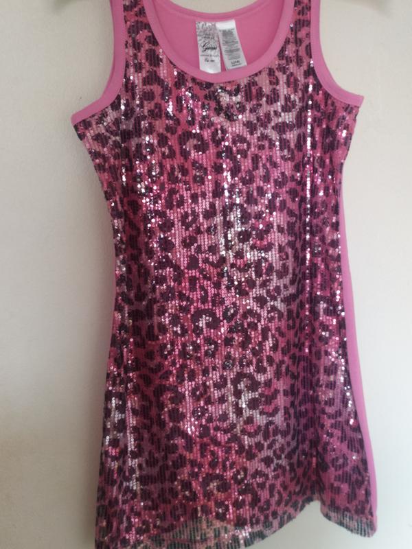 Сукня на дівчинку підлітка, або струнку дівчину, залежить від зростання, приблизно на 12-14 років. ширина під рукавами 40-41 ширина у талії 37-38 у стегнах 47-47 довжина сукні 70 см спереду принт паєтками леопард, ззаду трикотаж і логотип фірми вишитий люрекосовою ниткою. додаткові фото на запит.
