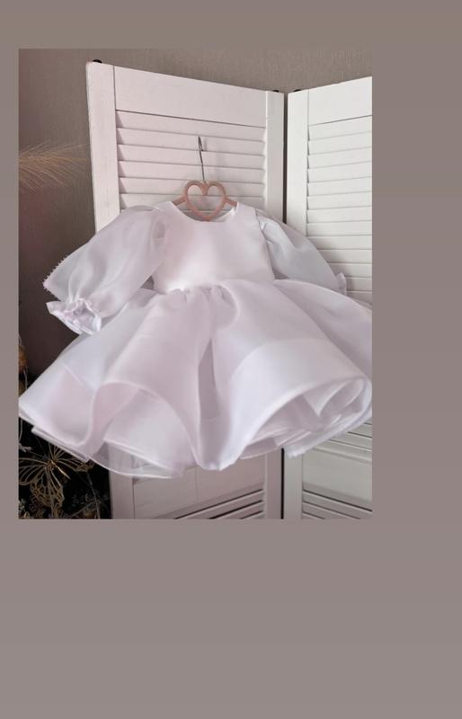 Дитяча святкова сукня. Розмір 76-80. Одягалась один раз для фото, дефектів не має. Підходить для будь якої пори року, рукав тоненький не парить. В подарунок білі пінетки. Також великий бант який знімається.