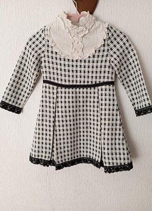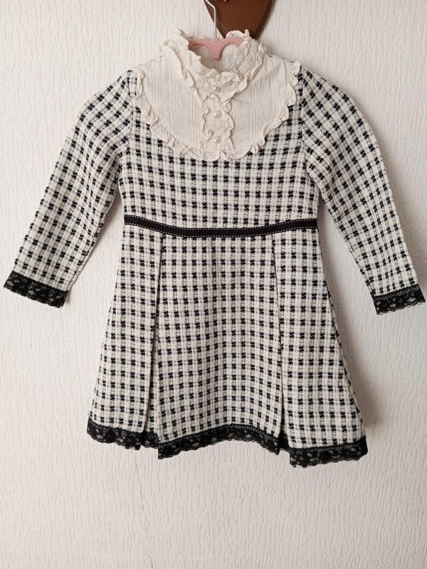 Неймовірно гарна сукня для дівчинки в клітинку з білим комірцем, оздоблена мереживом та стрічками., акцентні гудзики у формі перлинок.Тканина щільна та м'яка є підклад, ззаді на блискавці. Стан гарний, комірець потребує незначного відбілювання. плечі 25 рукав 40 Пот 30 довжина 63