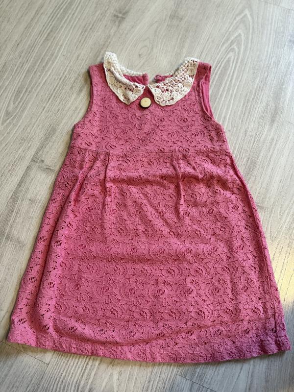 Сукня дуже красива на дівчинку 4-5 років. Рожевий колір, комірець білого кольору. Мереживна. З ґудзиком спереду. Довжина виробу 56 см. Пів обхват грудей 29 см. Пів обхват талії 30 см.