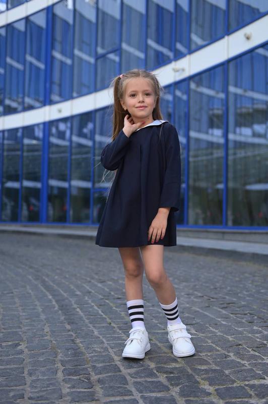 Сукня арт. e.v. 2066 Стильне плаття, турецька дорога костюмна тканина для шкільної форми (повітропроникна, практично не зминається і не скочується) Біле мереживо з атласу, рукав три чверті Застібається ззаду на блискавку Колір: синій, чорний Розміри: 128, 134, 140, 146, 152