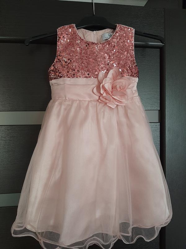 Очень нежное платье для принцессы 4-5 лет, украшенное пайетками, на поясе с цветком,3х слойный низ волнообразный,плечи 23,ПОГ 32,ПОТ 30,длина 58, пояс завязывается на бант.
