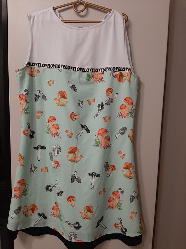 Легкое летнее платье комбинированное.Нежный светлый ярус декорирован синим окантом. Детский яркий принт на мятном фоне.Застежка пуговица перламутровый.Довжина -средняя.