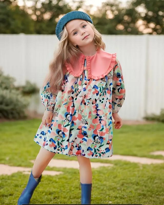 Сукня для дівчаток з квітковим принтом та обробкою на комірі - вільний крій, довгі рукава,стильний дизайн. Розмір 2-3 роки