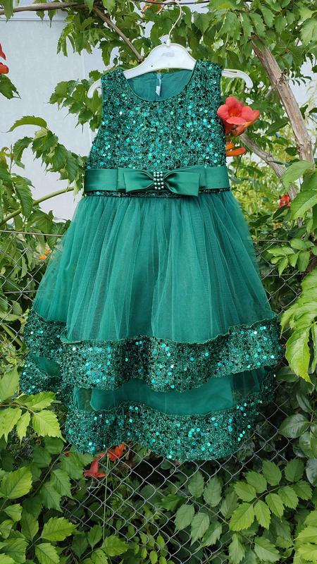 Зеленое платье на размер 120. Верхний фатин порвано. Одет только раз.