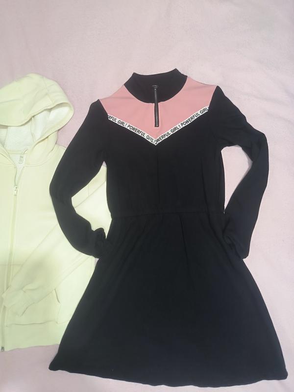 Сукня трикотажна,чорна з рожевими вставками. На зріст 146-152 см,пояс на ризинці. В подарунок утеплена кофтинка в молочному кольорі на застібці з капюшоном. Все в ідеальному стані, майже не носили