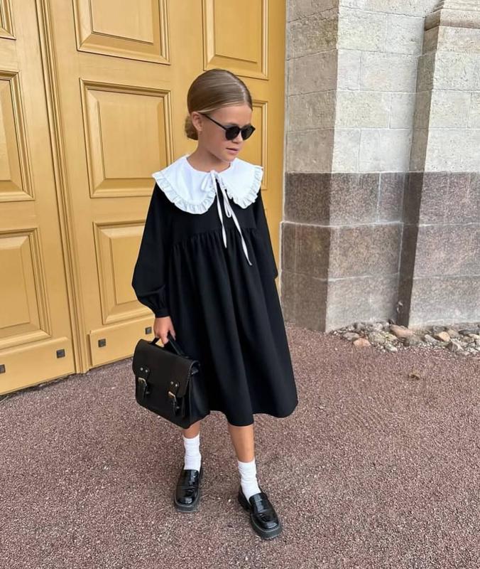 Сукня зі з‘ємним комірцем арт. sev. 1329 Розміри: 122, 128, 134, 140, 146 152 Тканина: якісна креп костюмка Турція Кольори: темно-синій, чорний та сірий Лаконічно та стильно одночасно! Образ, який красиво виглядатиме не лише першого вересня! Сарафан вільно крою, не сковує рух. Пасує під будь-який образ. Комірець завязується, рукавички на ґудзику.