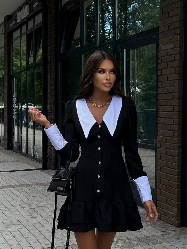 Сукня з акцентним комірцем та зтягуючими шнурочками на спинці. Візуально створює імітацію корсету та робить стрункішою талію ⌛️ Мод: 586 1486 Тканина: костюмка Армані + котон Розміри: 42-44, 46-48 Колір: чорно-білий Відмінна якість Кар