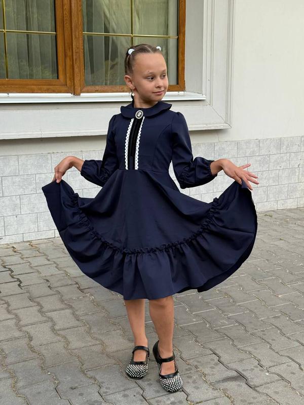 Сукня арт. sev. 1335 Розміри: 128, 134, 140, 146, 152 (зріст дитини) Тканина: креп костюмка Туреччина Кольори: чорний і синій Лаконічне, але незабутнє — це плаття створене для тих, хто цінує елегантність навіть у шкільній формі. Чіткі лінії, акуратний комір і продуманий крій надають образу стриману строгість, а м'який, приємний до тіла матеріал - комфорт протягом дня. Наголошує на індивідуальності, не порушуючи шкільний дрес-код. Ідеально підходить для навчання, урочистих лінійок та шкільних заходів. Стиль починається зі шкільної лави! Увага: позаду на змійці! Банту немає. Ціна 1030 грн Брошка +60 грн