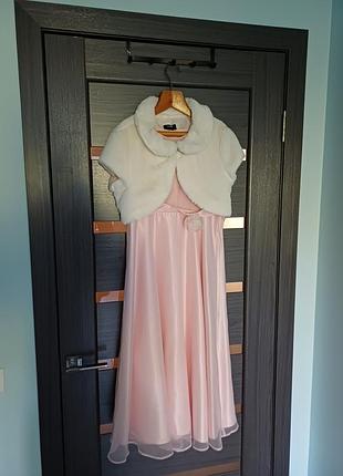 Платье в идеальном состоянии, размер 14 лет 164 см. Длина 112 см, до талии 31 см, полуобъем груди 42 см, полуобъем талии 40 см. Сзади застегивается на грудзики в виде цветка и подвязывается. На подкладке. Made in Morocco. Bodice - корсаж, 100% Silk - юбка 100% polyester - подкладка. Добавляется меховая жилетка, которая застегивается на крючок серебряного цвета. Полуобъем грудь - 44 см, плечо - 11 см. Длина 34 см.