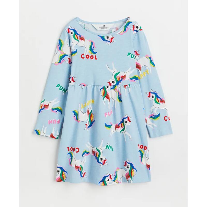 Детское трикотажное платье на девочку. Платье с длинным рукавом из мягкого хлопкового трикотажа с тематическим рисунком. Круглый вырез горловины, платье отрезное по сборке на талии, с пышной расклешенной юбкой. H&M. 6-8 лет - р.122/128: рукав от плеча 47, длина 67, ПОГ 32