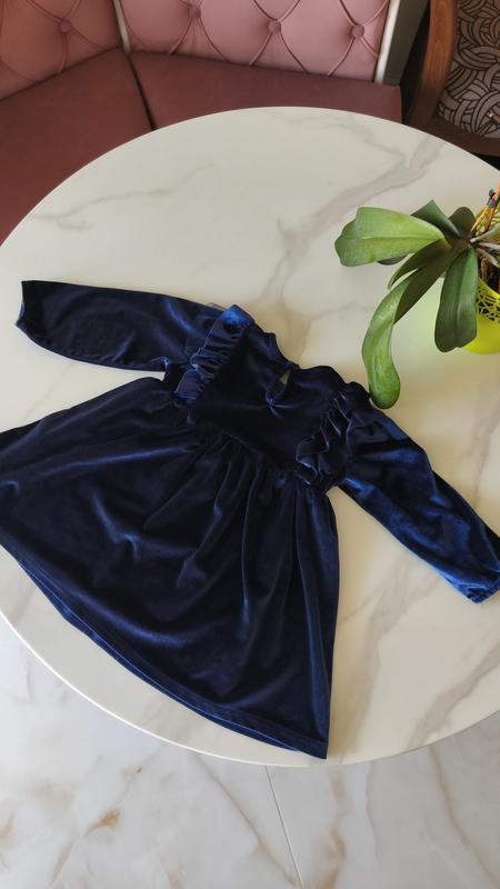 Сукня насиченого темно-синього кольору. Розмір вказаний 80-86 на 12-18 місяців але на мою доньку вже у 16 місяців було замале. Тому це радше 80.