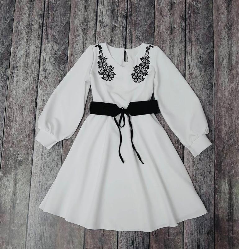 Сукня з вишивкою(не малюнок!!) Пясок в комплекті. По спинці застібається на ґудзик. Манжети на гудзиках. Пояс під резиночку. Тканина -костюмна, гарна якість. Колір - білий. Заміри: 140 довжина - 80см, напівобхват грудей - 38см, рукав від плеча - 49см. 146 довжина - 83см, напівобхват грудей - 40см, рукав від плеча - 51см. Розміри в наявності: 140-4шт 146-1шт арт мод