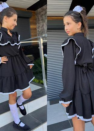 🆕🆕🆕🆕🆕🆕 платье с кружевом в черном цвете🥰 ‼️ткань долговечная, практичная (кр-жатка) талия и рукав на резинках, пояс ткань. мод 985 размеры: 134-140 146-152 158-164 🌹красивый, качественный отшил!, 🫶рекомендую!