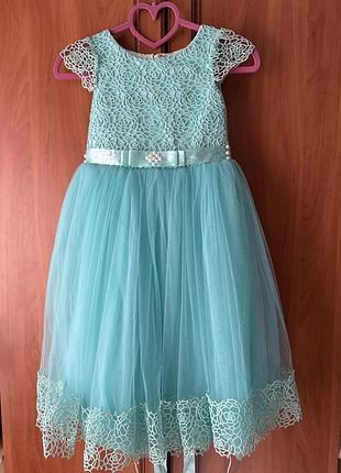Сукня для маленької принцеси на свято гарного бірюзового кольору. На зріст 122 см. Стан хороший, маленькі нюанси на фото. До сукні можна придбати діадему +50 грн. Колір більш насичений, ніж на фото.