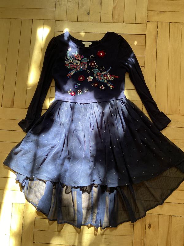 Гарна сукня для дівчинки з гарною вишивкою та аплікаціями,всі аплікації на місці,единий нюанс строчка друга трохи поторочилась,вказала на фото.Носили в школу.