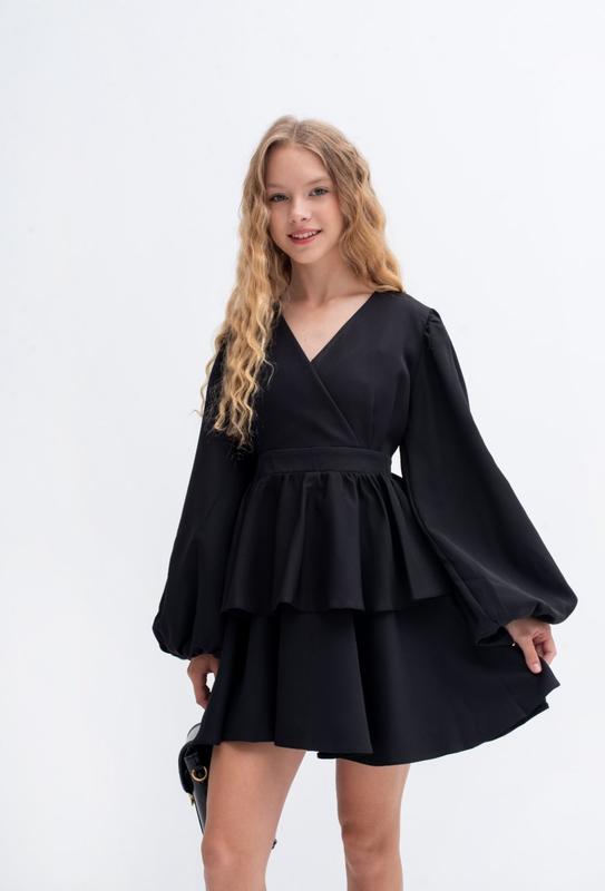 через кнопку купити тільки повна оплата!!!! Сукня на запах Пояс пришитий до сукні, зав'язується позаду. Тканина - костюмна. Колір - чорний. Заміри: 140 довжина - 68см, напівобхват грудей - 37см, рукав від плеча - 55см. 146 довжина - 72см, напівобхват грудей - 39см, рукав від плеча - 57см. Мс