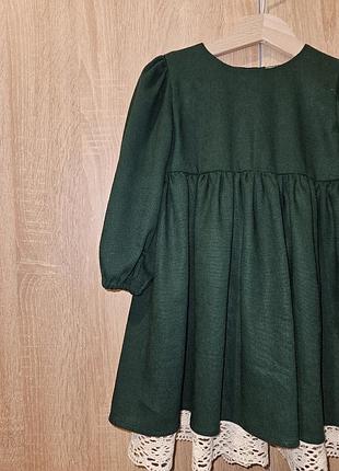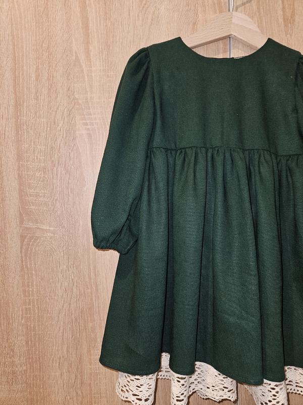 Льляна сукня на підкладі.Оздоблена х/б мереживом по низу сукні.Пишний рукавчик,низ на резиночці.Застібка сукні по спинці на гудзики. Комірчик і манжетики не входять у комплект,їх мажна придбати окремо.
