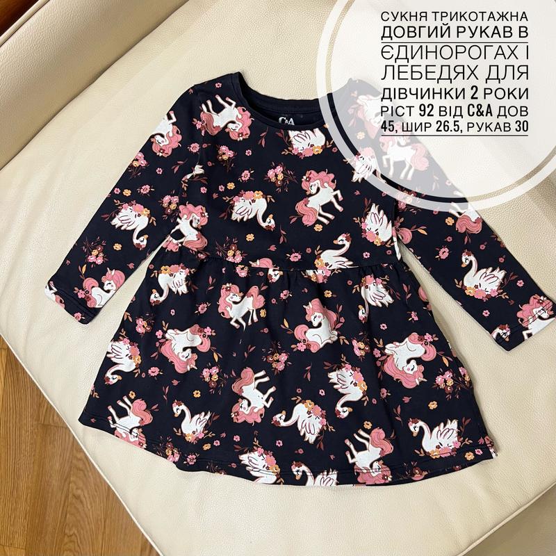 Сукня трикотажна довгий рукав в єдинорогах і лебедях для дівчинки 2 роки ріст 92 від C&A дов 45, шир 26.5, рукав 30