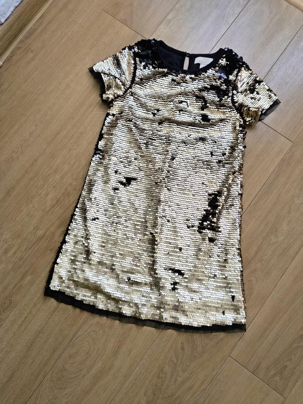 Плаття від Primark, вказано вік 5-6 років, але моя донька одягала в 7 років. Паєтки- перевертиші- можна золотий або чорний колір. З нюансів- у двох місцях немає кілька маєток (показала на фото)- в очіне кидається. Відповім на усі запитання зроблю більше фото і заміри