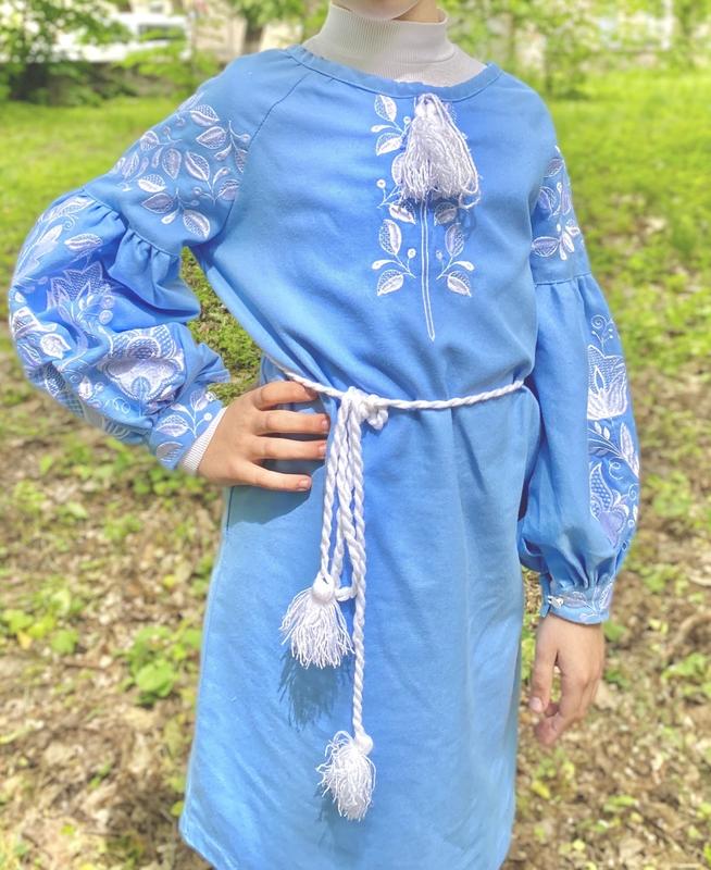 Розмір 122–128 см Стан: майже нова, одягалася 2-3 рази Дуже ніжна вишиванка з об’ємними рукавами і красивою білою вишивкою. М’яка тканина, зручна для школи, свят чи фотосесій. Йде з поясочком на талію.
