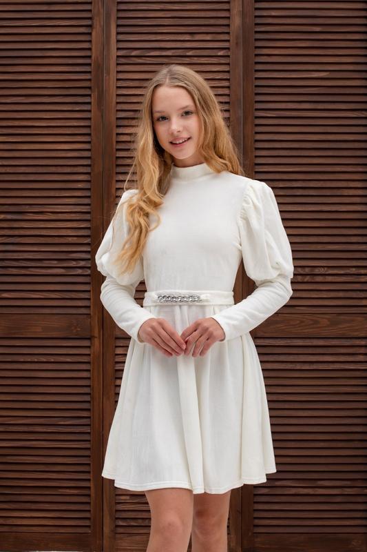 Стильна сукня для модниць По спинці до пояса застібається на блискавку. Пояск в комплекті. Тканина- королівський велюр, м'який та ніжний. Колір - молочний. Заміри: 140 довжина - 69см, рукав від плеча - 49см, напівобхват грудей - 36см 146 довжина - 72см, рукав від плеча - 51см, напівобхват грудей - 37см міс