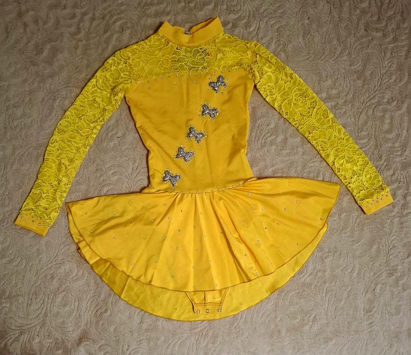 Продам ярко-желтое платье для выступлений на сцене, украшенное кружком и стразами. Платье также украшено серебристыми бабочками.