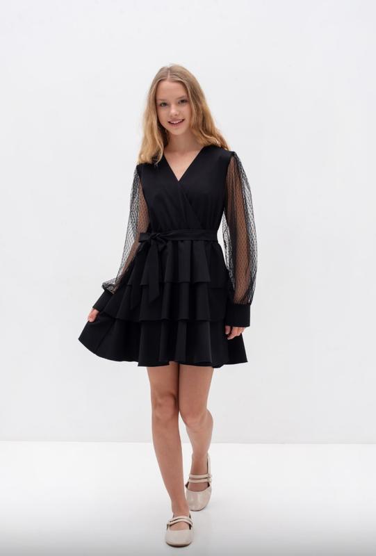 через кнопку купити тільки повна оплата!!! Сукня на запах з гарним рукавом Пояс сукні під резиночку. Поясок в комплекті. Тканина - костюмна + рукав - сітка. Колір - чорний. Заміри: 146 довжина - 71см, напівобхват грудей - 40см, рукав від плеча - 59см. 158 довжина - 77см, напівобхват грудей - 44см, рукав від плеча - 61см. 164 довжина - 83см, напівобхват грудей - 46см, рукав від плеча - 64см. Мс