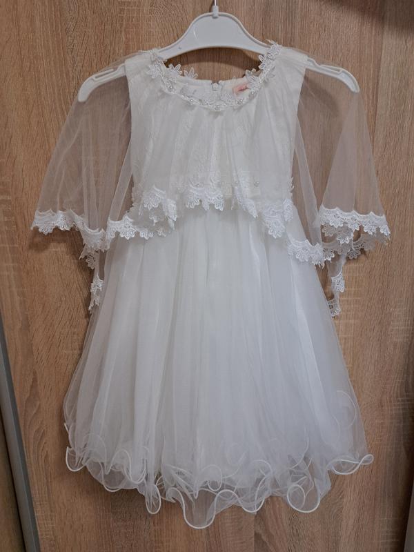 Дуже гарна святкова сукня кольору айворі.Розшите мереживом та намистинами. Позаду блискавка та атласний пасок. Улюблена сукня принцеси!Гарна накидка на плечах, багатошарова спідниця. Нюанс на фото,при носці не помітний зовсім! Заміри: Довжина 56 см Нот 29 см