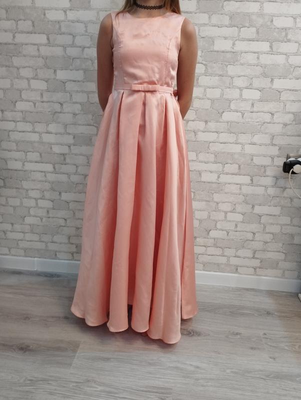 Сукня святкова для дівчини, зріст 150 см. Колір персиковий. Довжина від плеча 130 см, напівобхват талії 32 см. Збоку блискавка. На спині мереживо. Бант відстібається. Сукня купувалась для свята , була надягнути один раз