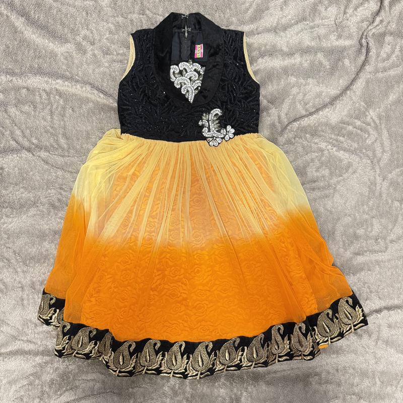 Стильна сукня з ефектним поєднанням чорного верху та спідниці омбре від жовтого до яскраво-помаранчевого. 🔸 Верх із блискучими декоративними елементами та вишивкою 🔸 Пишна спідниця з фатину та мереживної підкладки 🔸 Низ оздоблений вишитим орнаментом 🔸 Без рукавів, застібається на блискавку та гачки ззаду • Розмір: 128–134 / 7–9 років • Замір по грудях: 68 см • Довжина: 80 см