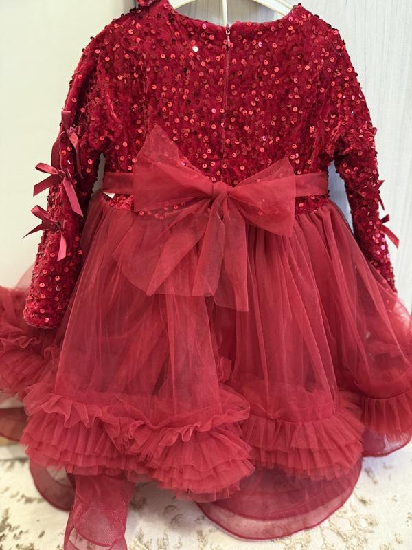 Новорічна сукня стан нової , одягнена один раз на свято. Надзвичайно гарна) не така як всі) тепленька, пишна 6 шарів , 3 фатин, підклад, та теплий підклад. блискуча) Класна ми залишились задоволені) Розмір можна від 116-123 Заміри : довжина від плеча 70, від плеча до поясу 22 йде завищена. Рукав вкорочений довжина 37. Плечі 28-29. Талія 35. Звертайтесь)