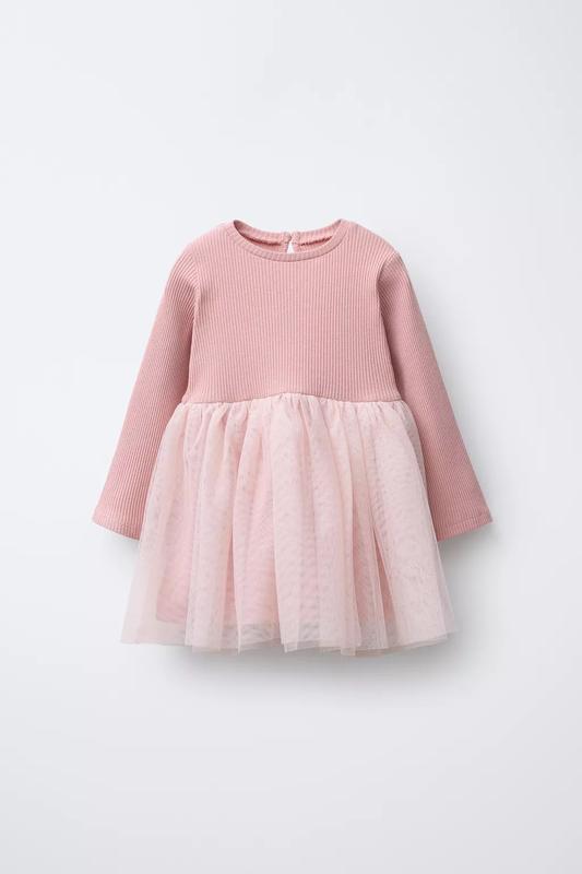 Комбінована сукня з круглим коміром та довгими рукавами. Застібка на ґудзик у формі краплі на спині. Спідниця з тюлю з блискучими деталями. Внутрішня підкладка в тон. ПАСТЕЛЬНО-РОЖЕВИЙ | 5767/545/621